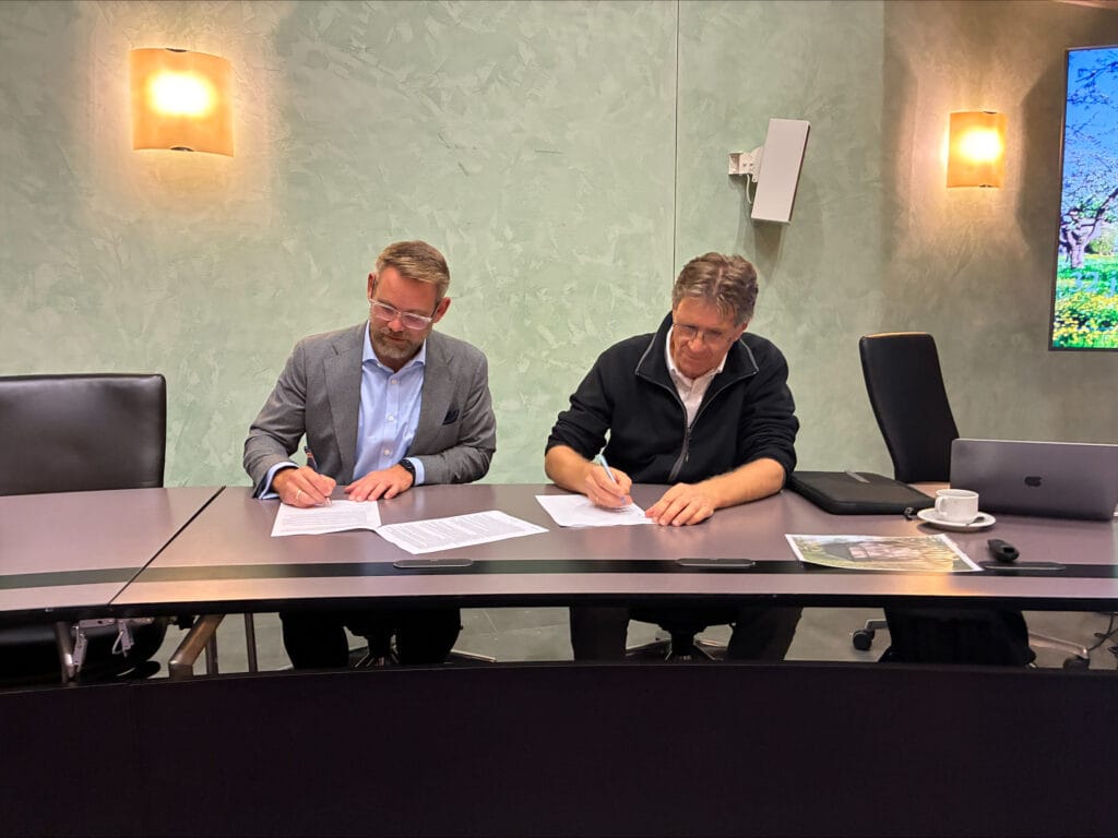 Mounet Stuiver en Peter Dijkstra tekenen als voorzitters tekenen het fusie- en overdrachtsdocument.