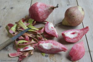 Enkele jaren geleden waren ze ineens overal te koop, Karmozijn stoofperen. Ik nam ze mee en experimenteerde ermee. Gestoofd, in jams en compotes, in ovenschotels en rauw in salades, de Karmozijn peer had mijn hart gestolen! Echter het jaar daarop, geen Karmozijn peren en het jaar daarop ook niet… Tot ik ze een paar weken geleden ineens bij de groothandel en bij de groenteman zag liggen. Blij nam ik er wat mee.Ik verwacht niet dat ze binnenkort net als de Gieser Wildeman in de supermarkten te koop zullen zijn maar omdat het zo’n prachtige peer is kon ik het niet nalaten om er iets over te schrijven.De Karmozijn peer zien er ongeschild uit als een flinke dikbuikige handpeer maar eenmaal uit zijn jasje en doorgesneden ziet deze bijzondere peer er spectaculair uit. Onder de geelgroene ruwe schil met een rossig blosje zit knalroze gemarmerd vruchtvlees.De Karmozijn, of de Karmozijn de Sonneville zoals de peer officieel heet, is gekweekt door Ing. P. De Sonnaville in Winssen en ontstond door de bloesem van de Conference te bestuiven met stuifmeel van de Bloedpeer. Daardoor ontstond een dikbuikige handpeer die weer bestoven werd met stuifmeel van de Kreeftspeer, een stoofpeer. Het uiteindelijke resultaat? De Karmozijn de Sonnaville!De peer heeft een wat zoetzure smaak en stooft in 10-15 minuten gaar. Tijdens het stoven verliest de Karmozijn weliswaar zijn roze knalkleur maar krijgt wel een mooie rozerode kleur. De gestoofde Karmozijn peren hebben een heerlijke perensmaak en het vruchtvlees smelt bijna in je mond.Rijpe Karmozijn peren kunnen ook als handpeer gegeten worden maar dat heeft niet mijn voorkeur. Het vruchtvlees is wat hard maar daardoor is de karmozijn wel weer heel geschikt voor verwerking in salades. Dunne plakjes knalroze Karmozijn peer in bijvoorbeeld een groene salade geeft je salade nog meer kleur.De Karmozijn is heel geschikt als stoofpeer, om er perenmoes en jam van te maken en in ovenschotels en salades te gebruiken.Karmijn de Sonnaville